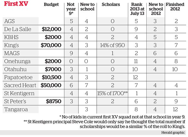 The 12 teams in the 1A competition are estimated to spend close to $500,000 on their respective First XVs, drawn from school funding, sponsorships and old-boy networks. Half the teams in the competition offer specific rugby scholarships. Across the 12 squads, 38 boys are listed as new to their respective school in the past two years. Sacred Heart alone has seven of those boys listed in its First XV squad. Auckland Grammar, Mt Albert Grammar, St Kentigern and Kelston Boys' High School each have four.